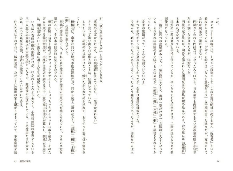 舞台は1989年、東京・中野。その一角だけ武蔵野の面影を残すような樹木の生い茂る洋館のアパート。ここに暮らすのは6歳から66歳までの男女7人。世代も境遇も異なるが、生まれた家や婚家などで家族に傷つき、偶然にここに集まってきた。大家族のように暮らしながら、それでいて個の生活に踏み入らない節度に、住人は癒やされ、強くなっていく。樹々や草花、鳥や昆虫、そして手作りの料理の数々…。日常をいとおしむような場面に彩られた小説は、今こそ輝きを放つ。