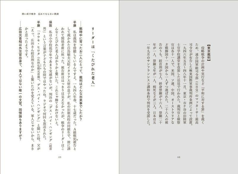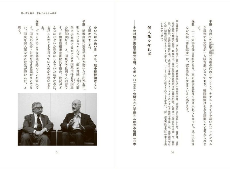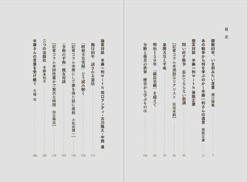 これら珠玉の対談を埋もれさせまいと、盟友・保阪正康氏を監修に迎え、保阪氏はもちろん、作家・田口ランディ氏、日本近現代史が専門の古川隆久氏、半藤氏の親友で国文学者の中西進氏を相手にした、計7本の対談を一冊にまとめた。半藤氏の妻・半藤末利子氏の寄稿も収録。