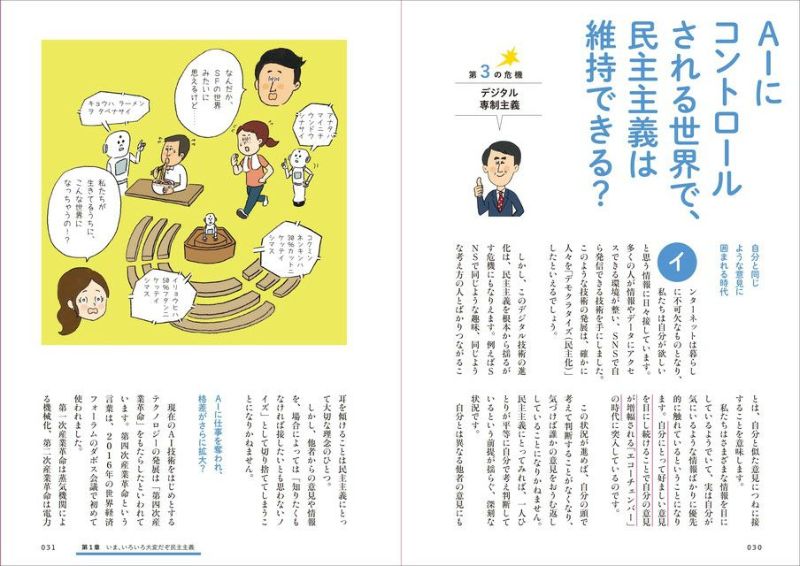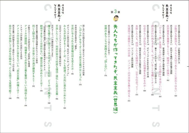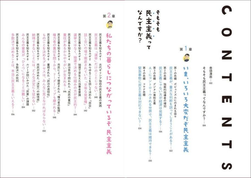 だれでも知っていて、当たり前のように思っている民主主義。でも、「民主主義って何?」と聞かれ、ズバリ答えられる人は多くはないでしょう。多数決や選挙、議会制だけが民主主義の本質を表しているのではありません。日本を代表する政治学者の宇野重規教授が、イラストを使いながら、身近な例に置き換えてわかりやすく解説します。世の中が大きく変わろうとしている今、「民主主義」について、一度立ち止まって考えてみませんか?