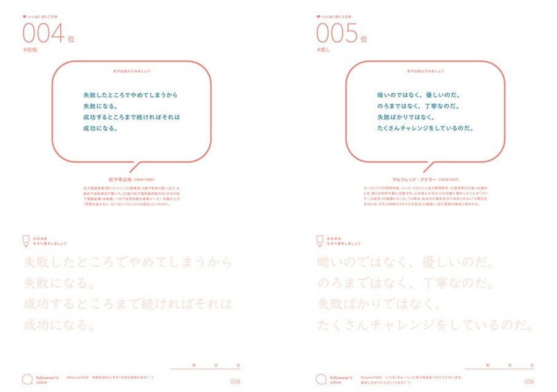 まずは読んで名言を味わい、そしてじっくりと文字を書けば、写経のようなヒーリング効果も期待できます。
