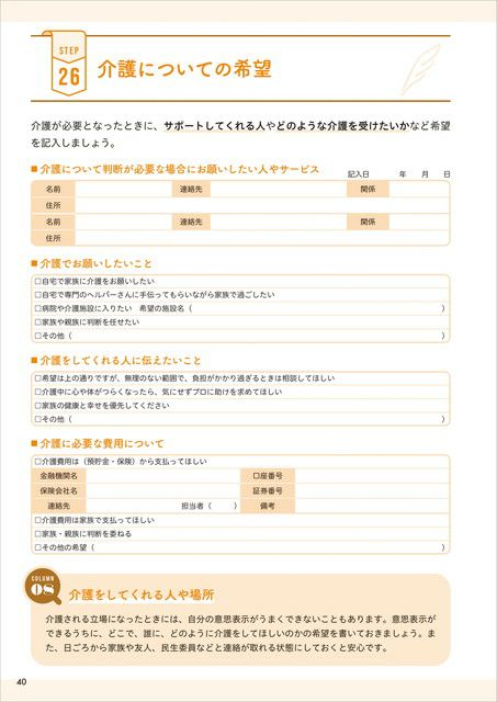 そんなときに、医療や介護についての希望や資産についての情報がまとめてあると、希望に近い医療や介護のプランを立てることができます。