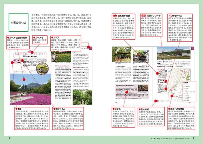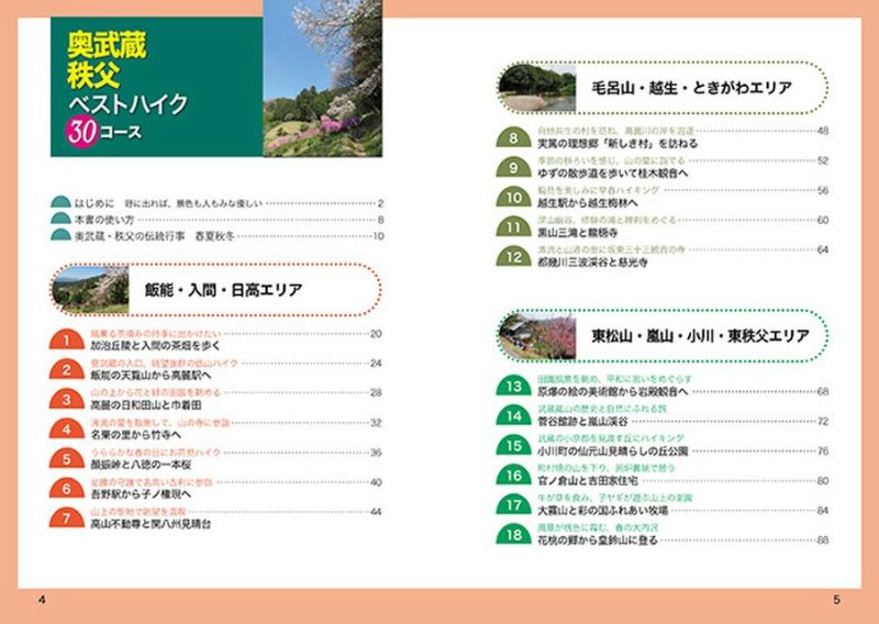 「飯能・入間・日高」「毛呂山・越生・ときがわ」「東松山・嵐山・小川・東秩父」「寄居・本庄・長瀞・皆野」「横瀬・秩父・小鹿野」の5つのエリアに分けた計30コースを、知的好奇心をくすぐる紀行文と、コースで出合う美しい風景や見どころのカラー写真、詳細な地図のほか参考タイムや交通アプローチも掲載して案内します。現地にまつわる歴史、文化、自然などを紹介するコラムも充実した大満足の日帰りハイキングガイドです。