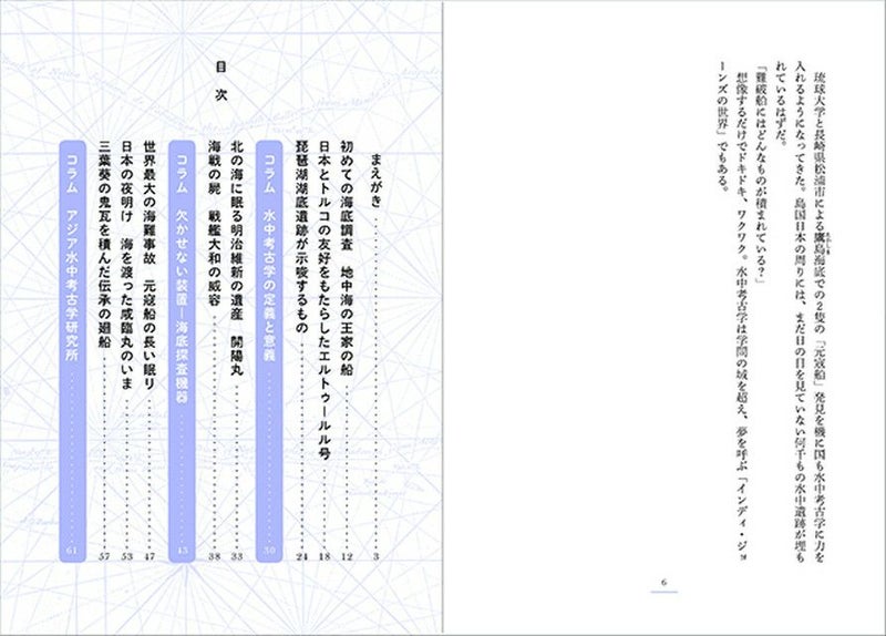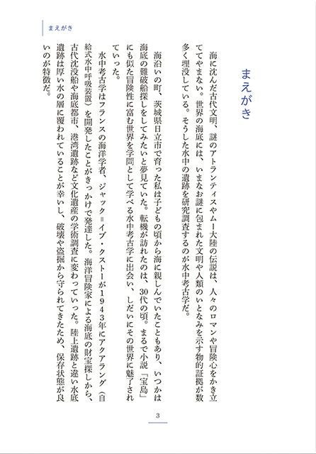 水底には、お宝が眠っています。水中考古学ではそれらの宝をハントするためでなく保護するために調査・研究を行っています。文化、化学、地学など様々な分野における「歴史的な発見」という宝のために、です。言い伝えや書物などを元に探査し、発見して、引き揚げ、保存し、解明する――それが水中考古学です。