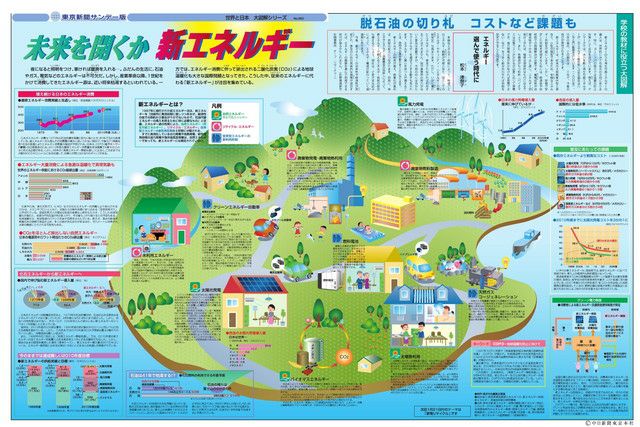 夜になると照明をつけ、寒ければ暖房を入れる・・・。ふだんの生活に、石油やガス、電気などのエネルギーは不可欠だ。しかし、産業革命以降、1世紀をかけて消費してきたエネルギー源は、近い将来枯渇するといわれている。一方では、エネルギー消費に伴って排出される二酸化炭素(CO2)による地球温暖化も大きな国際問題となってきた。こうした中、従来のエネルギーに代わる「新エネルギー」が注目を集めている。