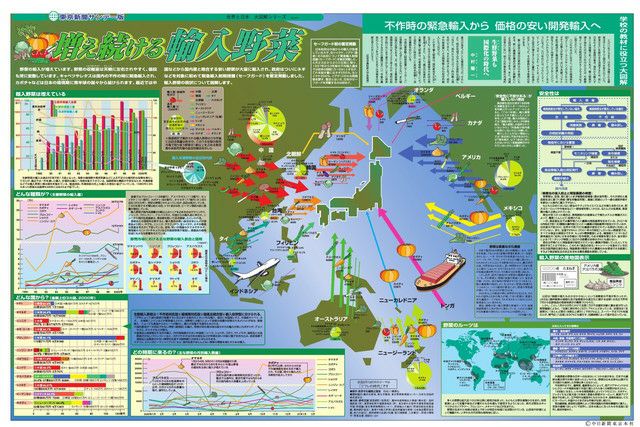野菜の輸入が増えています。野菜の収穫量は天候に左右されやすく、値段も常に変動しています。キャベツやレタスは国内の不作の時に緊急輸入され、カボチャなどは日本の端境期に南半球の国々から届けられます。最近では中国などから国内産と競合する安い野菜が大量に輸入され、政府はついにネギなどを対象に初めて緊急輸入制限措置(セーフガード)を暫定発動しました。輸入野菜の現状について図解します。
