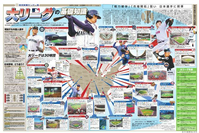 150年を超える歴史を持ち、アメリカの国民的娯楽と呼ばれる野球。その頂点にある大リーグ(メジャーリーグ)で、イチローなどの日本人選手がこれまでにない活躍を見せています。彼らの活躍を楽しむための大リーグの基礎知識を図解します。