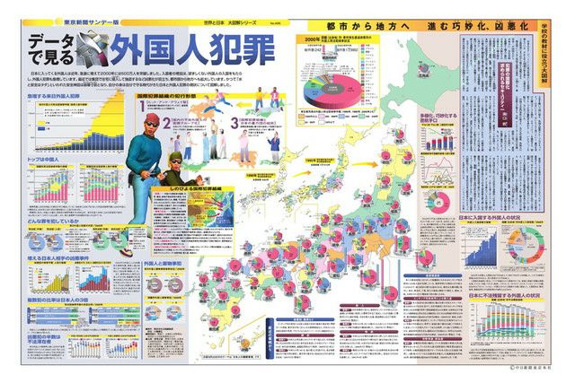 日本に入ってくる外国人は近年、急激に増えて2000年には500万人を突破しました。入国者の増加は、望ましくない外国人の入国をもたらし、外国人犯罪も急増しています。最近では集団で住宅に侵入して強盗するなど凶悪化が目立ち、都市部から地方へも拡大しています。かつて「水と安全はタダ」といわれた安全神話は崩壊寸前となり、自分の身は自分で守る時代がきた日本と外国人犯罪の現状について図解しました。