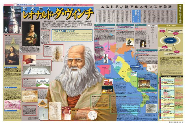 いま日本はイタリアブーム。人間的でおおらかな文化が人気の秘密ですが、その原点は現代にも大きな影響を与えている約500年前のルネサンス。なかでも「モナリザ」をはじめ、絵画、科学など様々な分野でめざましい活躍をしたレオナルド・ダ・ヴィンチはその象徴です。イタリア文化を体現した知の巨人の世界を図解します。