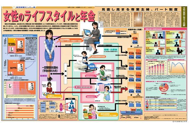 現在の年金制度は、会社員の夫と専業主婦の妻(第3号被保険者)という世帯を基本にしています。また、収入のない専業主婦は保険料を負担していません。しかし、女性の就業が増えるなか、会社勤めの女性などから、保険料負担と年金給付の面で不満の声が強くなっています。女性の年金の現状と、2004年の制度改正に合わせ、共働き世帯を基本にするように提言した「女性と年金検討会」(厚生労働相の諮問機関)の見直し案を整理しました。