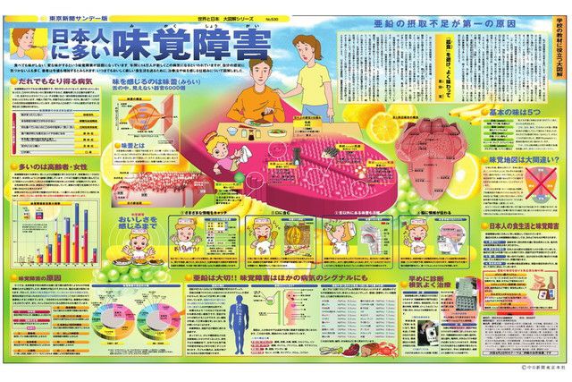 食べても味がしない、変な味がするという味覚障害が話題になっています。年間に14万人が新しくこの病気になるといわれていますが、自分の症状に気づかない人も多く、患者は今後も増加するとみられます。いつまでもおいしく楽しい食生活を送るために、治療法や味を感じる仕組みについて図解しました。