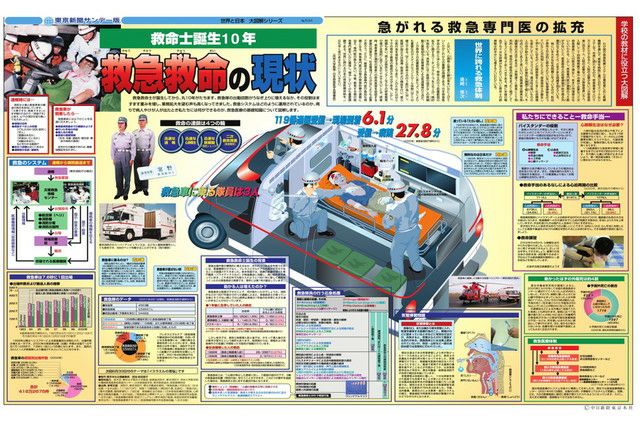 救急救命士が誕生してから、丸10年がたちます。救急隊の出動回数がうなぎ上りに増えるなか、その役割はますます重みを増し、業務拡大を望む声も高くなってきました。救急システムはどのように運用されているのか、周りで病人やけが人が出たとき私たちには何ができるのか、救急医療の基礎知識について図解します。