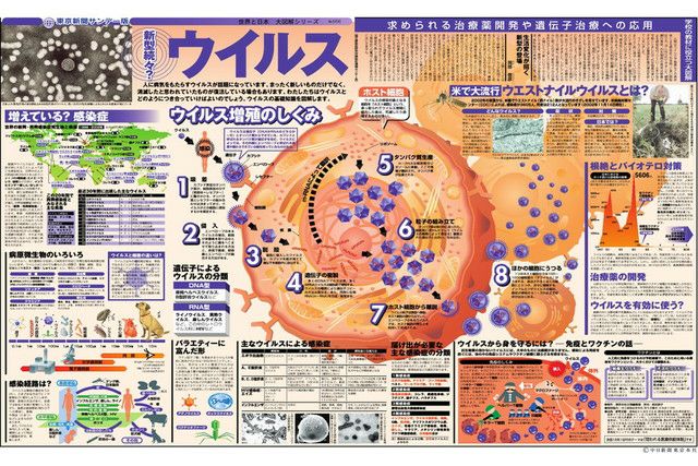 人に病気をもたらすウィルスが話題になっています。まったく新しいものだけでなく、消滅したと思われていたものが復活している場合もあります。私たちはウィルスとどのようにつき合っていけばよいのでしょう。ウィルスの基礎知識を図解します。