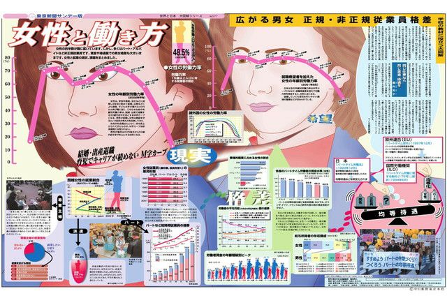 女性の約半数が職に就いています。しかし、多くはパート・アルバイトなど非正規従業員です。賃金や待遇面での男女格差も大きいままです。女性と就業の現状、課題をまとめました。
