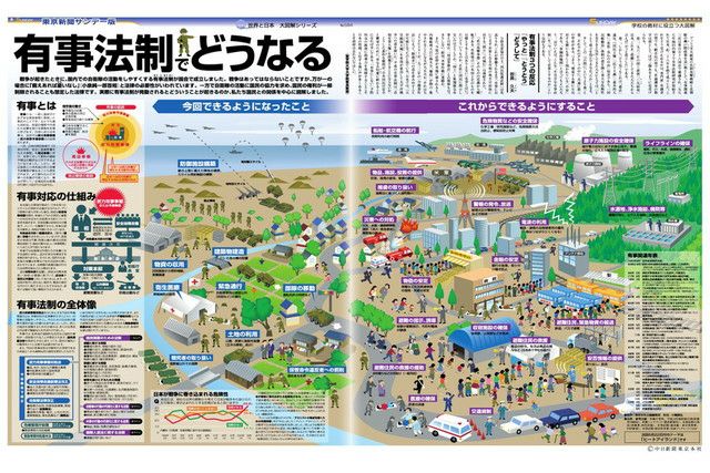 戦争が起きたときに、国内での自衛隊の活動をしやすくする有事法制が国会で成立しました。戦争はあってはならないことですが、万が一の場合に「備えあれば憂いなし」(小泉純一郎首相)と法律の必要性がいわれています。一方で自衛隊の活動に国民の協力を求め、国民の権利が一部制限されることも想定した法律です。実際に有事法制が発動されるとどういうことが起きるのか、私たち国民との関係を中心に図解しました。