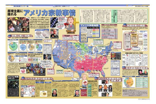清教徒(ピューリタン)が礎を築いたアメリカは「自由の国」であると同時に、先進国では宗教色が濃厚な社会ともいわれます。米中枢同時テロ以後、ブッシュ政権の外交政策の基調にはキリスト教原理主義的な世界観も見え隠れします。唯一の超大国を理解する為に不可欠であるアメリカ宗教事情を図解します。