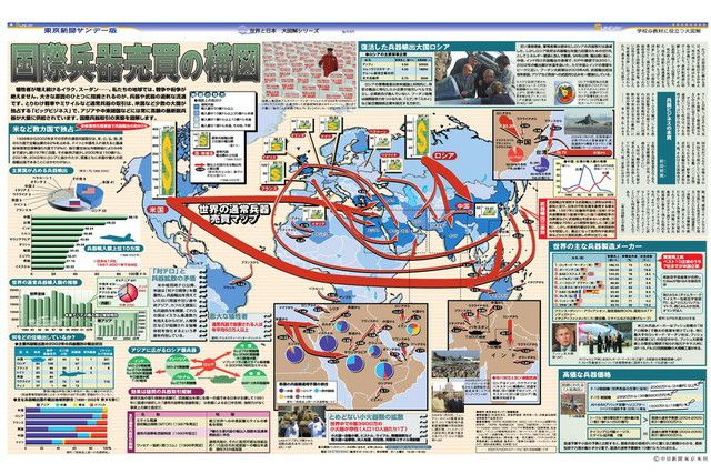 犠牲者が増え続けるイラク、スーダン・・・・・・。私たちの地球では、戦争や紛争が絶えません。大きな原因のひとつに指摘されるのが、兵器や武器の過剰な流通です。とりわけ戦車やミサイルなど通常兵器の取引は、米国など少数の大国が独占する「ビッグビジネス」で、アジアや中東諸国などには常に高額の最新鋭兵器が大量に供給されています。国際兵器取引の実態を図解します。