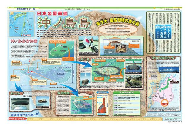 東京から南へ約1700キロの太平洋上に日本の最南端、沖ノ鳥島があります。満潮時には2つの小島が海面に顔を出すだけの、ほとんどが海面下というサンゴ礁でできた無人島です。この島により日本は広大な排他的経済水域(EEZ)を主張できます。日本政府や東京都は沖ノ鳥島の保全に真剣に取り組んでいます。