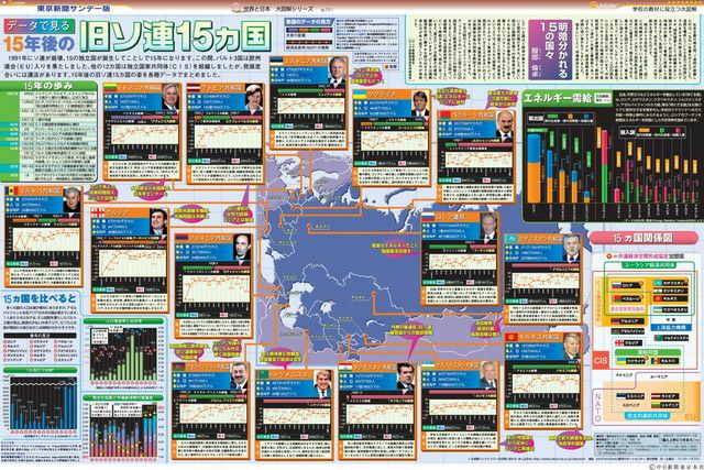 1991年にソ連が崩壊、15の独立国が誕生してことしで15年になります。この間、バルト3国は欧州連合(EU)入りを果たしました。他の12カ国は独立国家共同体(CIS)を組織しましたが、発展度合いには濃淡があります。15年後の旧ソ連15カ国の姿を各種データでまとめました。