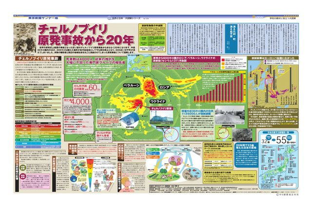 世界の原発史上最悪の事故となった旧ソ連のチェルノブイリ原発事故からまもなく20年になります。半径30キロ圏内のほか、300キロも離れた場所が高汚染地域として今も居住禁止となり、500近い村や町が消えてしまいました。多数の犠牲者と周辺の地域社会を丸ごと消滅させてしまった原発事故について図解します。