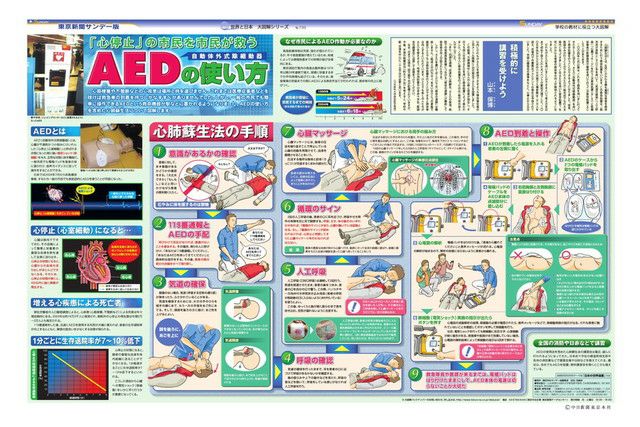 心筋梗塞や不整脈などの心疾患は場所と時を選びません。これまでは医療従事者などを除けば救急車の到着を待つしかなすすべがありませんでした。しかし、一般の市民でも簡単に操作できるAEDという救命機器が駅などに置かれるようになりました。AEDの使い方を含めた心肺蘇生法について図解します。