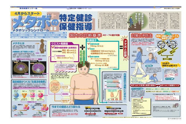 生活習慣病や動脈硬化などの原因とされるメタボリックシンドローム(内臓脂肪症候群、通称メタボ)を早期発見する「特定健診・特定保健指導」が4月から始まります。職場や自治体の健康診断で、40~74歳を対象に実施されます。メタボと予防法について図解します。