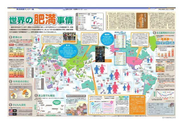 食欲の秋を迎えています。肥満人口は世界的に増え、いまや世界の6人に1人が体重超過です。肥満は糖尿病などの生活習慣病のリスクを高める要因です。折しも11月14日は糖尿病の予防、治療の啓発をする国連の「世界糖尿病デー」。世界の肥満の現状についてまとめました。