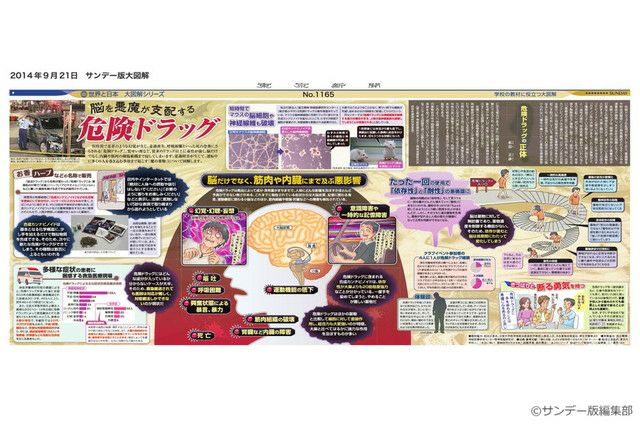 短時間で悪夢のような幻覚が生じ、意識喪失、呼吸困難といった死の恐怖にさらされる「危険ドラッグ」。覚せい剤など、従来のドラッグ以上に毒性が強く、脳だけでなく、内臓や筋肉の細胞組織まで侵してしまいます。意識障害が生じて、運転中に多くの人を巻き込む事故まで起こす「魔の薬物」について図解します。