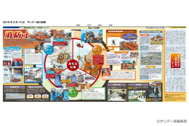 火災は全国で年間4万3741件。1日に約120件起きています(2014年)。気をつけていてもいつどこで起こるかわからない火災や天災から、人びとの暮らしを守ってくれる消防士の仕事を図解します。