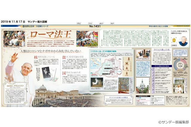 ローマ法王フランシスコが11月に来日。法王の来日は38年ぶり。キリスト教徒が少ない日本では縁遠く思う人も多いかもしれません。法王は国家を超え、世界のカトリック教徒約13億人のリーダーであり、「スーパー外交官」「国際社会の良心」として核廃絶や環境、貧困や格差問題についても発信しており、そのスピーチに常に世界の注目が集まります。