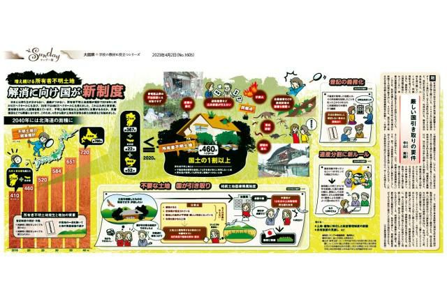 日本には持ち主が分からない、連絡がつかない、所有者不明土地面積が推計で2016年に約410万ヘクタールにも及び、20年では460万ヘクタールにも増えました。これは九州と東京都、愛知県を合計した面積を超えています。不明土地の増加は土地利用に支障があるほか、災害復旧などでも障害になります。このため、4月から国が土地を引き取る新たな制度などを始めました。