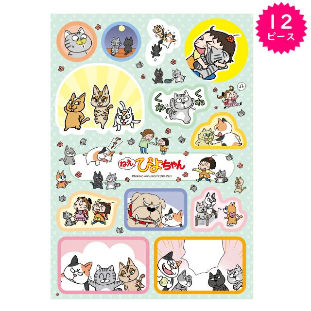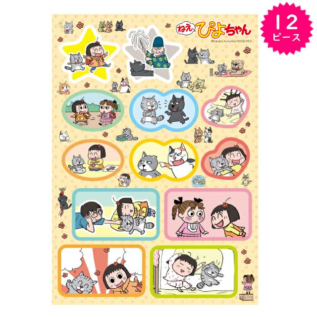 東京新聞の大人気四コマ漫画「ねえ、ぴよちゃん」がオリジナルシールになりました。 ぴよちゃんと又吉(またきち)のコンビだけでなく、花畑町のネコたちも登場です。 枠付きのシール部分の外側にもたくさんネコたちが顔をのぞかせ、にぎやかで可愛らしいシールです。 ★全2種: イエロー、グリーン ■商品概要 材質(シール) : PVC 台紙サイズ : A6サイズ(縦148×横105mm) 対象年齢 : 6歳以上 内容量 : 1枚入り・12ピース