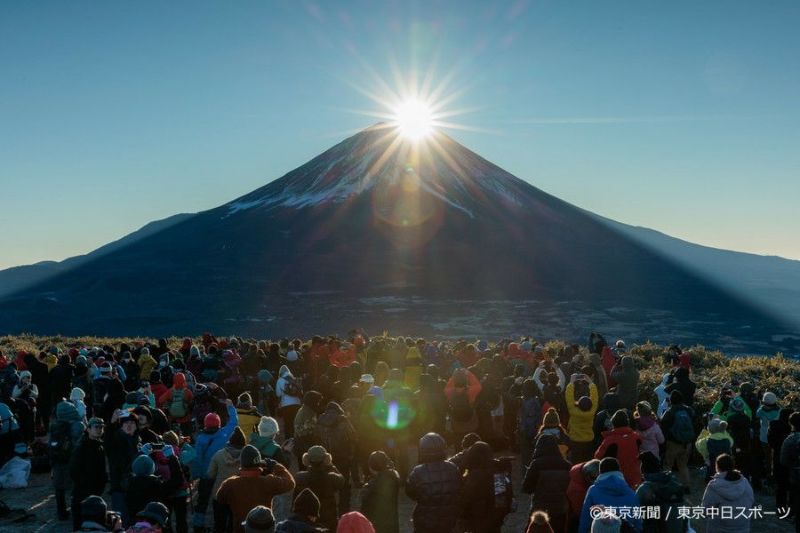 幼なじみと訪れた埼玉県三芳町の会社員野島智子さん(46)は「登って良し、見て良しの富士山は、どこから見てもテンションが上がる特別な存在。初めてのダイヤモンド富士に感動しました」と笑顔。「今年は良いことがありそう」と幸福な一年を願っていた。(文と写真・隈崎稔樹 紙面構成・折尾裕子)