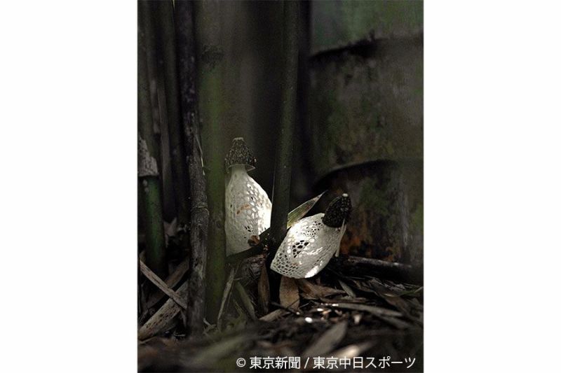 薄暗い竹林で、木漏れ日が当たるとキラリと光った。白いレースのような菌網を広げたキヌガサタケだ。ドレスをまとったような優雅な姿から「キノコの女王」と呼ばれる。