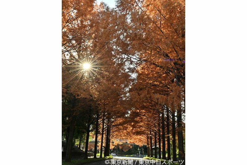 小田急線唐木田駅から徒歩10分ほど。歩道橋から並木道「メタセコイア通り」を眺めると、順光を浴びたオレンジ色の木々が緑豊かな団地の中で際立って目を引く。まるで、そこだけカーペットを敷いたかのように、風景をふっくらと彩っていた。
