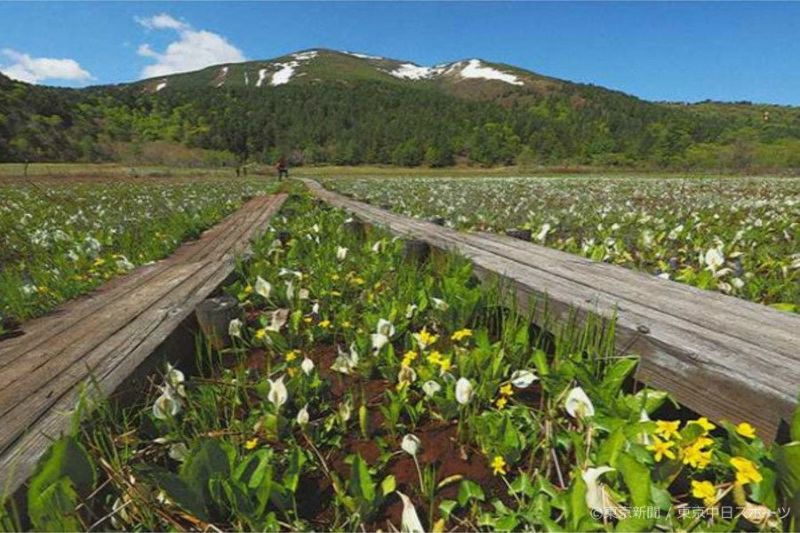 群馬、福島、新潟の3県にまたがる尾瀬ケ原。後方には至仏山(しぶつさん)が見える。初夏の湿原にはミズバショウやリュウキンカなどが咲き、ハイカーを楽しませていた(2021年5月31日撮影)(文・笠原和則/写真・隈崎稔樹 紙面構成・岡本恵里子)
