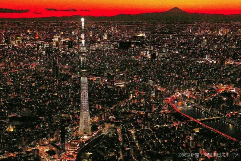 夕焼け空にくっきりとしたシルエットを浮かび上がらせる富士山と東京スカイツリー=墨田区で、本社ヘリ「おおづる」から(伊藤遼撮影)