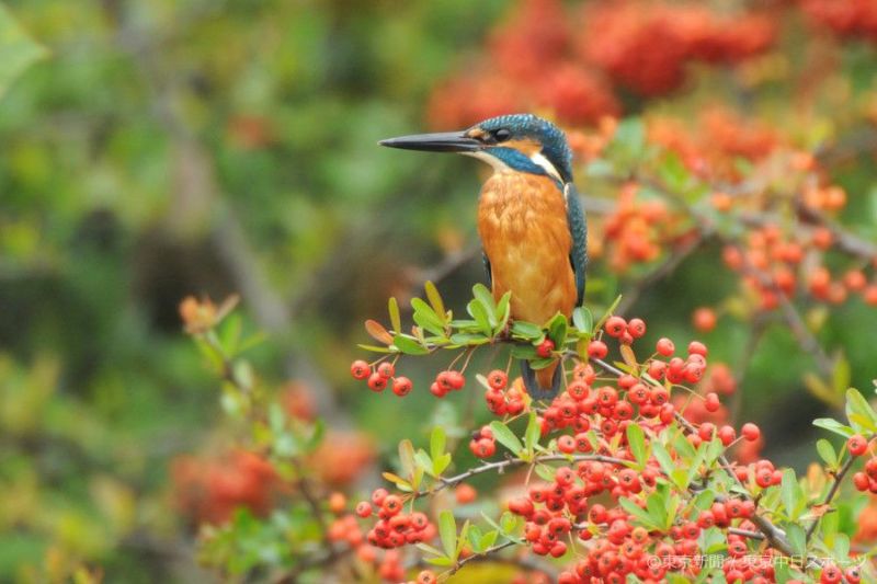 東京都清瀬市の金山調節池で1日、秋の色に熟したピラカンサに止まるカワセミ。鮮やかな赤い実と美しい「飛ぶ宝石」のコントラストが圧巻だ。この枝に止まるのは実の採食でなく、池の小魚を捕獲するため。