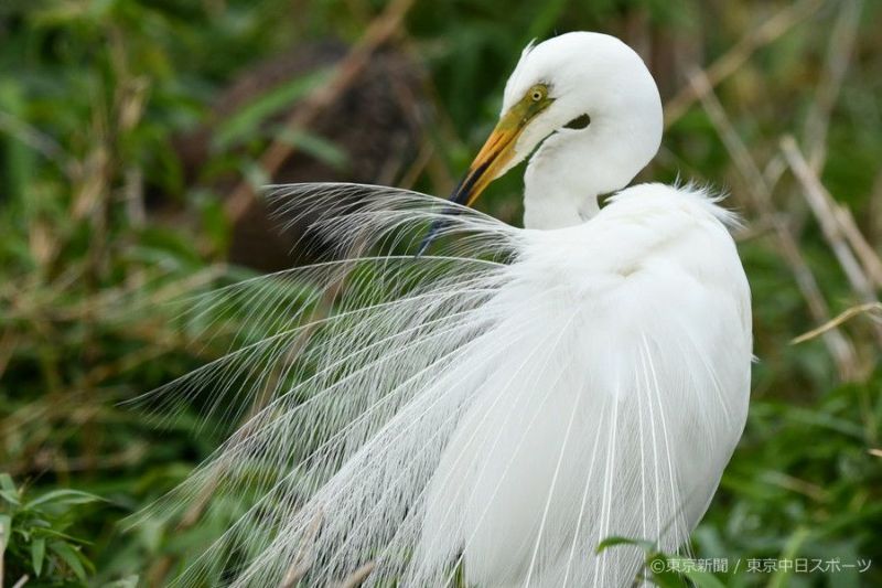 茨城県土浦市の桜川河川敷で6月中旬、背中から伸びた美しい飾り羽をくちばしで羽づくろいするダイサギ。飾り羽は繁殖期の春から夏に見られる白いレース状の羽。求愛などで使われる。かつて同県坂東市の集団繁殖地で観察した時、まるでクジャクの羽のように大きく広げてくれた。