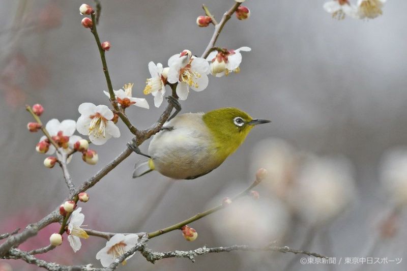 「梅にウグイス」のことわざがあるためか、メジロはウグイスによく間違われる。「ホーホケキョ」と鳴くウグイスは茂みの中が多くて見るのが難しい。花の枝にいることが多いメジロが鳴いたと思うのだろう。ウグイスは茶褐色でメジロは黄緑色だ。全長12センチ。 (写真と文・堀内洋助)
