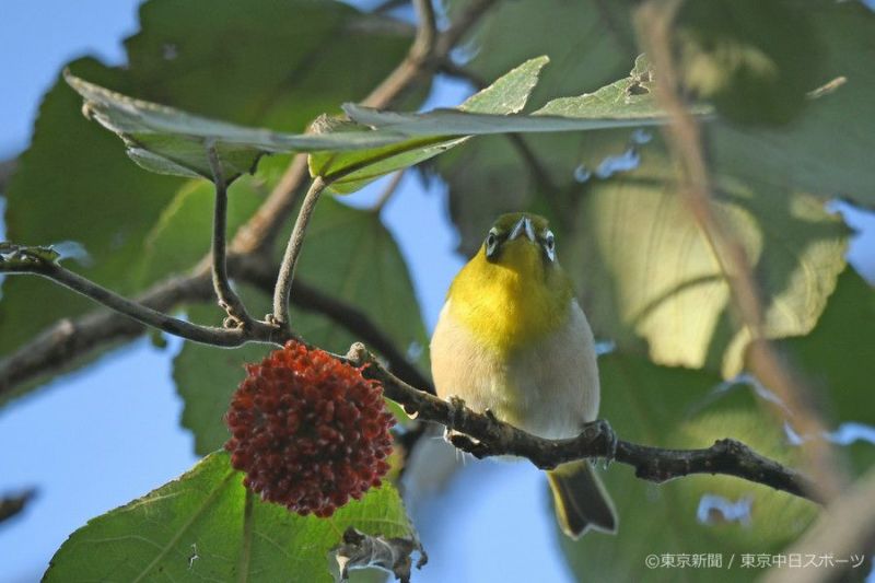 群馬県館林市の多々良沼公園で2日、熟した赤い木の実を食べるメジロ。一瞬、目線をもらった正面顔がかわいらしい。黒いくちばしがなぜか白く見えた。白いアイリングとともに魅了される。のどから胸の黄色が一段と鮮やか。