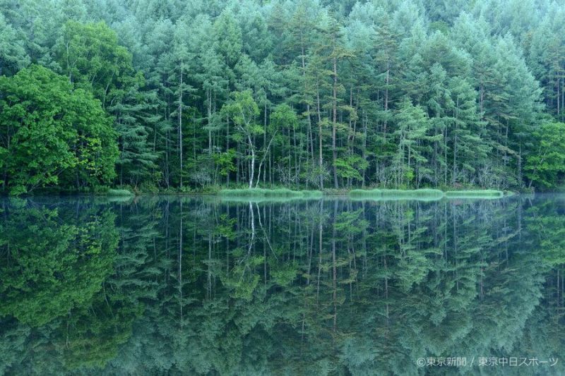 夜明け前、霧に包まれた白い世界が広がった。次第に霧が晴れ、鏡のような水面に静かな森が浮かんできた。緑と青が描く幻想的な色に思わず身震いした。風が少し吹き、水鏡を揺らした。待つこと1時間余。シラカバとカラマツの森が一瞬、鮮明に映った。まるで名画のような絶景に至福の時を感じた。