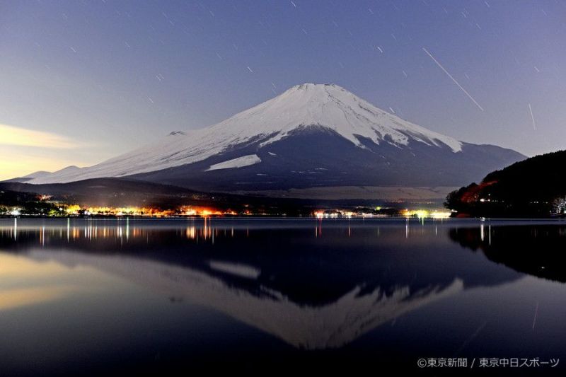 富士山麓の山中湖(山梨県山中湖村)に3月上旬、訪れた。標高982メートル。夕焼けの撮影を終えるころ風がやんだ。波が消えて、静かな湖面に逆さ富士が現れた。次第に富士山は月明かりに照らされて神々しい姿に。街灯りと航空機の光跡、星空も湖面に映った。フクロウの声を時々聞きながらの撮影は、至福の時だった。