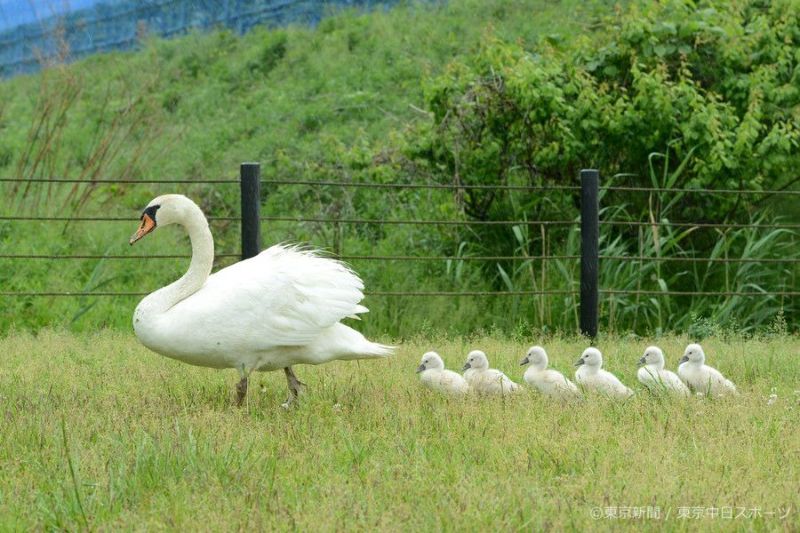 愛鳥週間(10日~16日)の中日に、千葉県我孫子市と柏市にまたがる手賀沼を探鳥した。小雨が降る中、手賀大橋の近くでひな6羽を連れたコブハクチョウ親子に出会った。草地で採食後、水辺に向かう時、よちよち歩きのひなが一列になり、懸命に母親の後を追う光景が印象的だった。真っ白な産毛の姿も愛らしい。かつて何度も取材した東京・大手町の内堀通りを渡り皇居に向かうカルガモ親子を思い出した。野鳥が魅せる一瞬の光景に感動する。