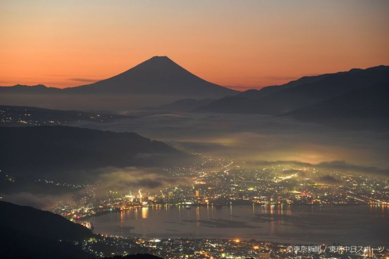 長野県塩尻市の高ボッチ高原で今月上旬、諏訪湖畔の街灯りと雲海の彼方に秀麗な富士山を撮影した。湖面に映る光が幻想的だ。日の出約45分前、東の空の地平線は紫と黄、赤橙色に色づき始めた。気温は1度。カメラをさわる指先が冷たい。晩秋の夜明け前の神々しい光景に胸が高鳴った。